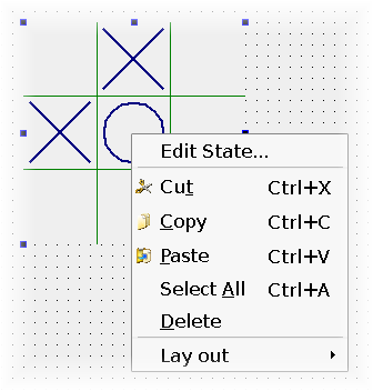 A task menu extension is a collection of QActions. The actions appear as entries in the task menu when the plugin with the specified extension is selected. The image above shows the custom Edit State... action which appears in addition to Qt Designer 's default task menu entries: Cut , Copy , Paste etc.