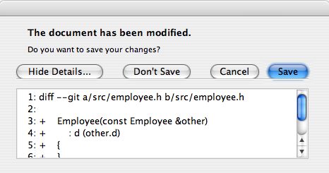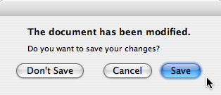 int ret = QMessageBox.warning(this, tr("My Application"), tr("The document has been modified.\n" "Do you want to save your changes?"), QMessageBox.Save | QMessageBox.Discard | QMessageBox.Cancel, QMessageBox.Save);